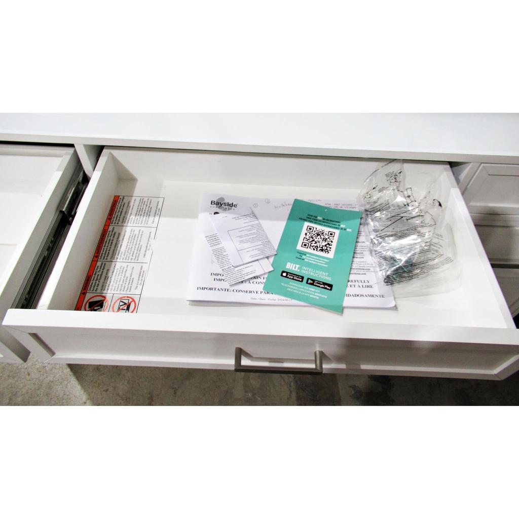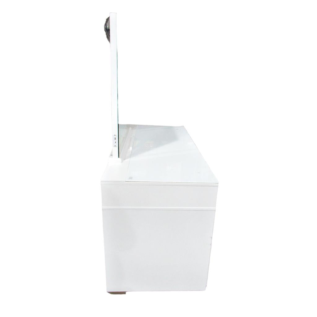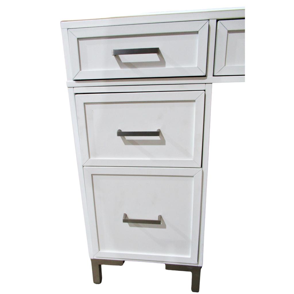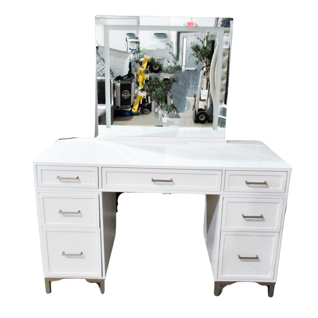 This product is used - Vanity shows signs of use all over - Drawers are sticky to open and close and top right drawer not lined up - Tempered glass on top is scratched - Phone/tablet holder has blue paint - Local pickup only
