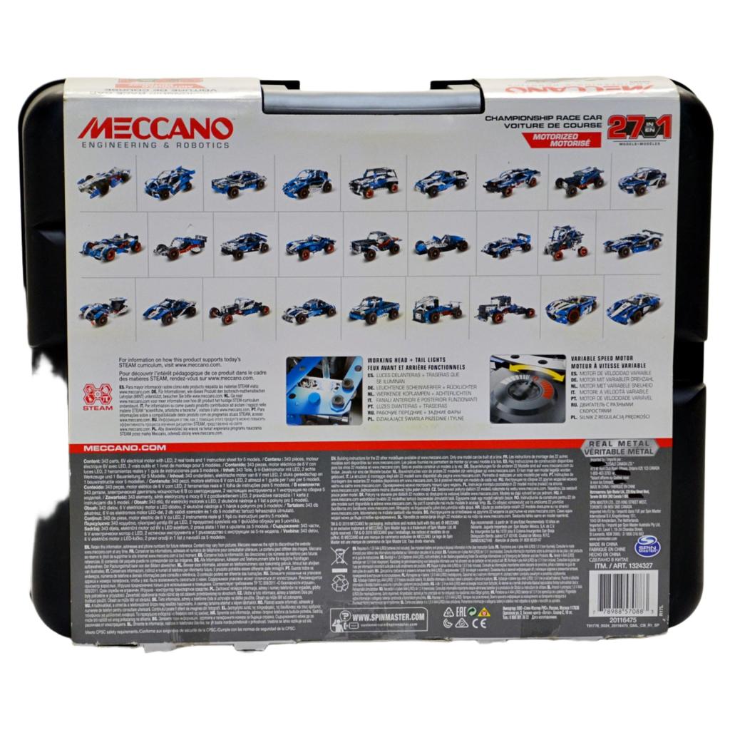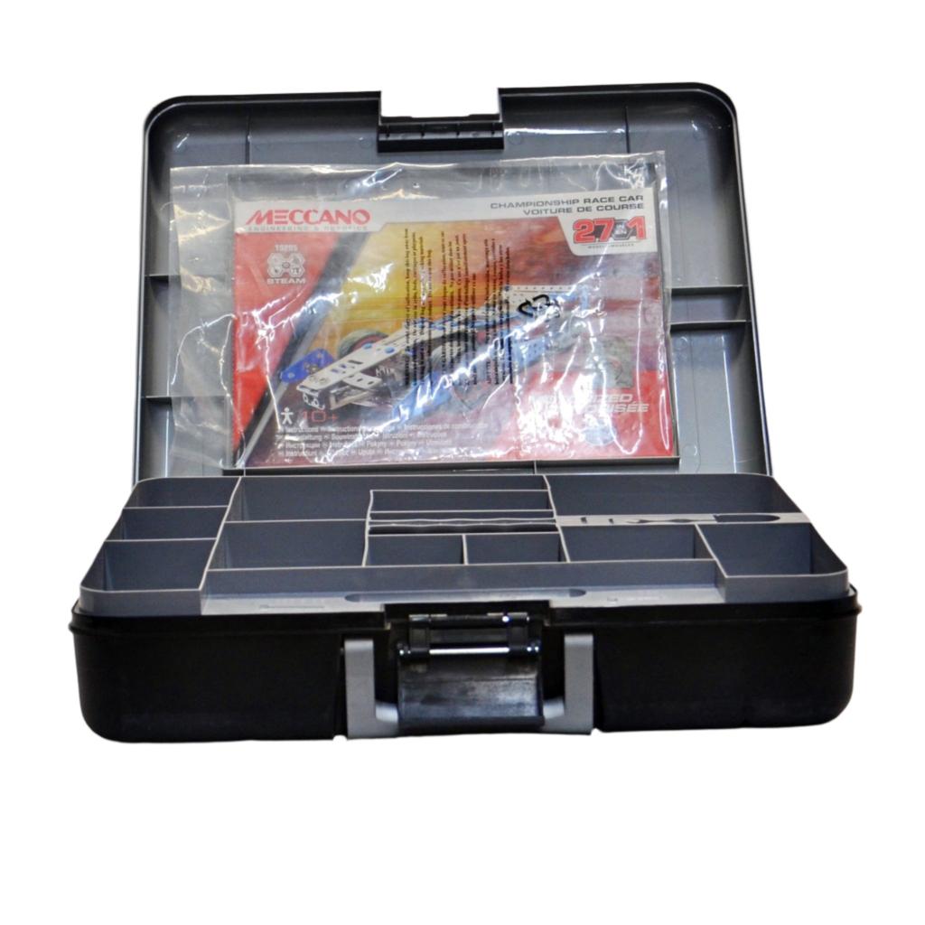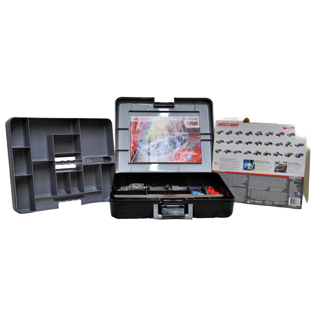 Minor damage to the cardboard sleeve around the case. Inside you will find two tools, a 6V electrical motor (tested and working), instructions and an undetermined amount of pieces. Possibility of missing pieces. Being sold AS IS.