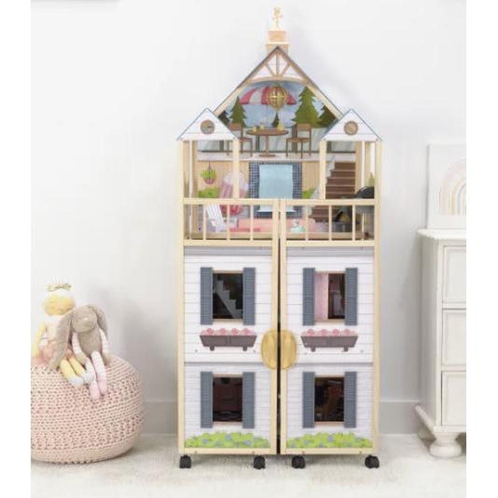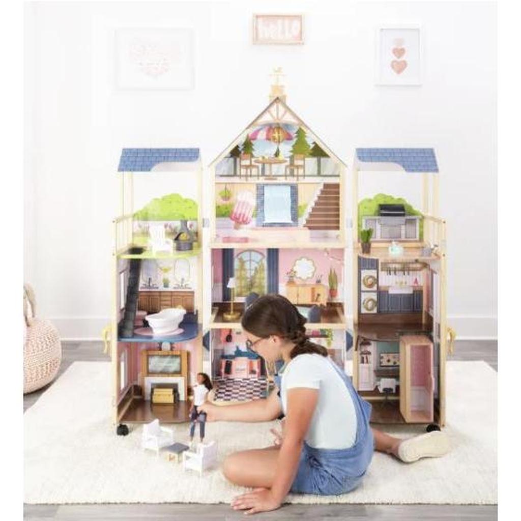 Open up a world of imagination in the KidKraft Secret Reveal Wooden Mansion. The realistic-looking door handle allows the sides to majestically swing out and expand the play area. The entire five-foot dollhouse is on wheels so you can move it to any room of the home.