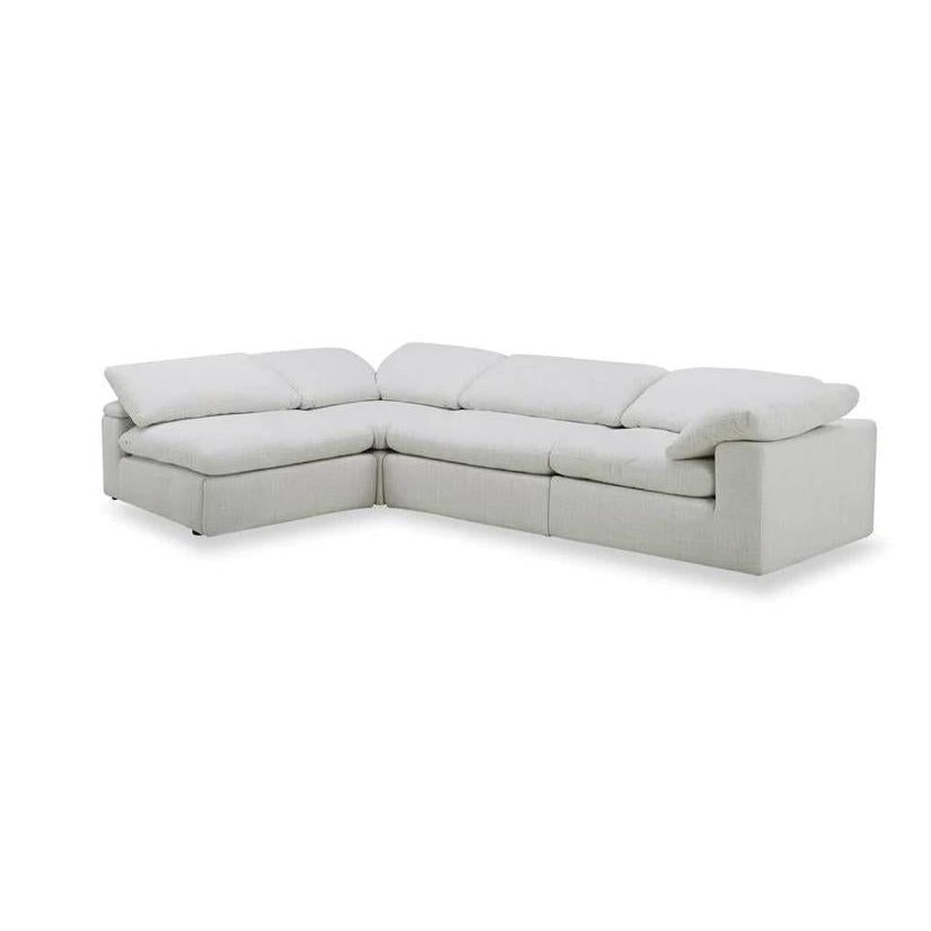 Relax in comfort while showcasing your eye for luxury with this Sky four-piece sectional. Boasting modern design, this piece is seamlessly wrapped in sleek white fabric with soft edges and rounded corners. Plus, you can lean back into comfortable feather down cushions for prime relaxation. With its modular design, build onto it with any of the additional Sky modular components (sold separately) for a personalized look. An elegant display of modern aesthetics, the Sky will elevate any home, providing comfort and style.