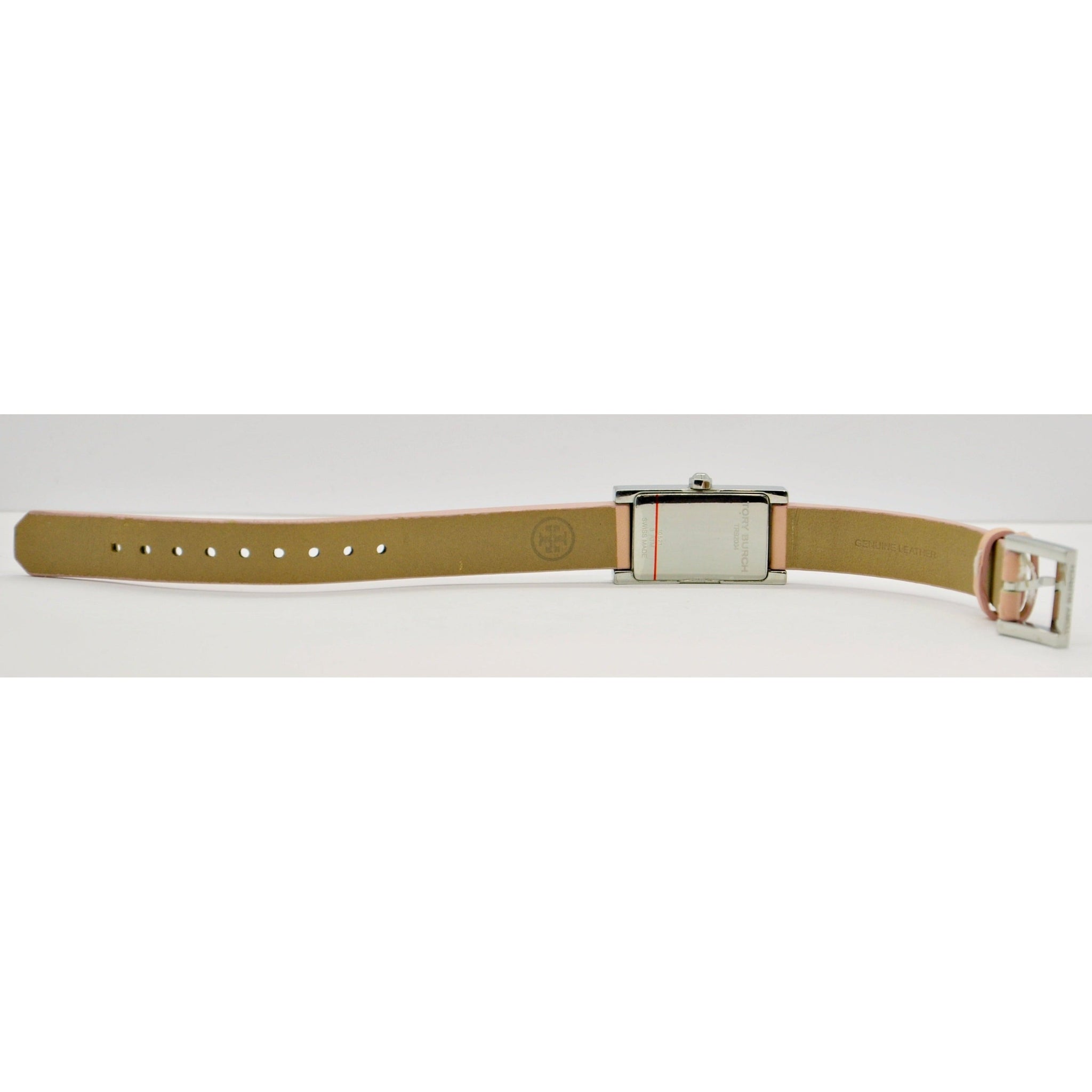 - Smooth silver-tone stainless steel case, pink leather band, buckle closure